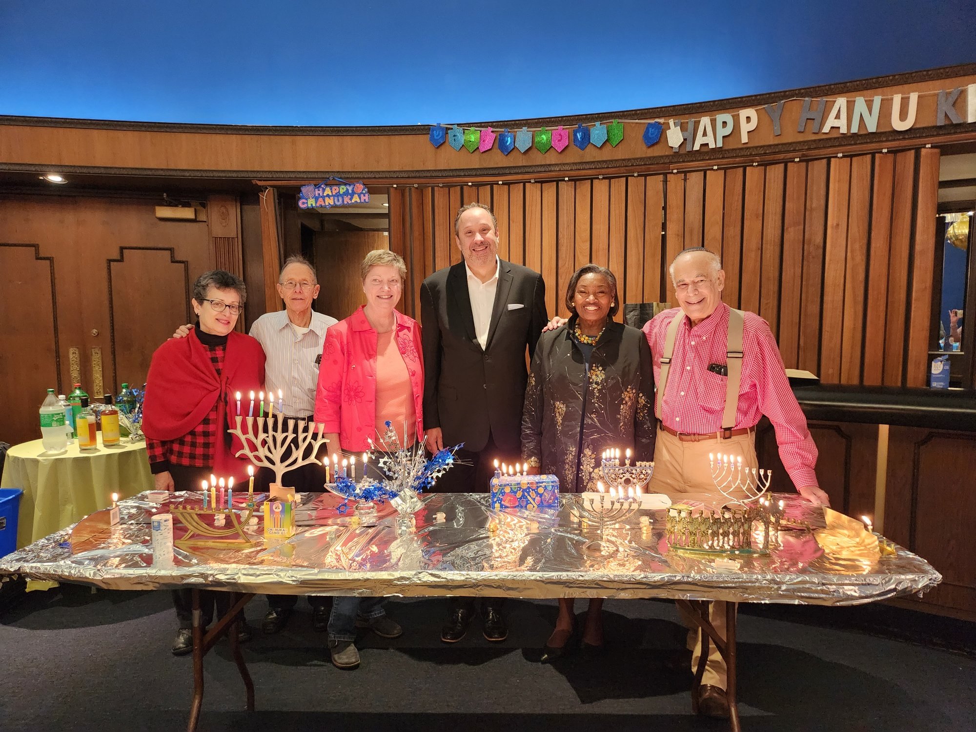 LPJC Board Members Sara Schweizer, Jack Schweizer, Eileen Schnitzler, Joe Schnitzler, Rabbi David Sebbag with Majority Leader Andrea Stuart Cousins for Menorah Lighting, Channukah Party, Dec. 10, 2023